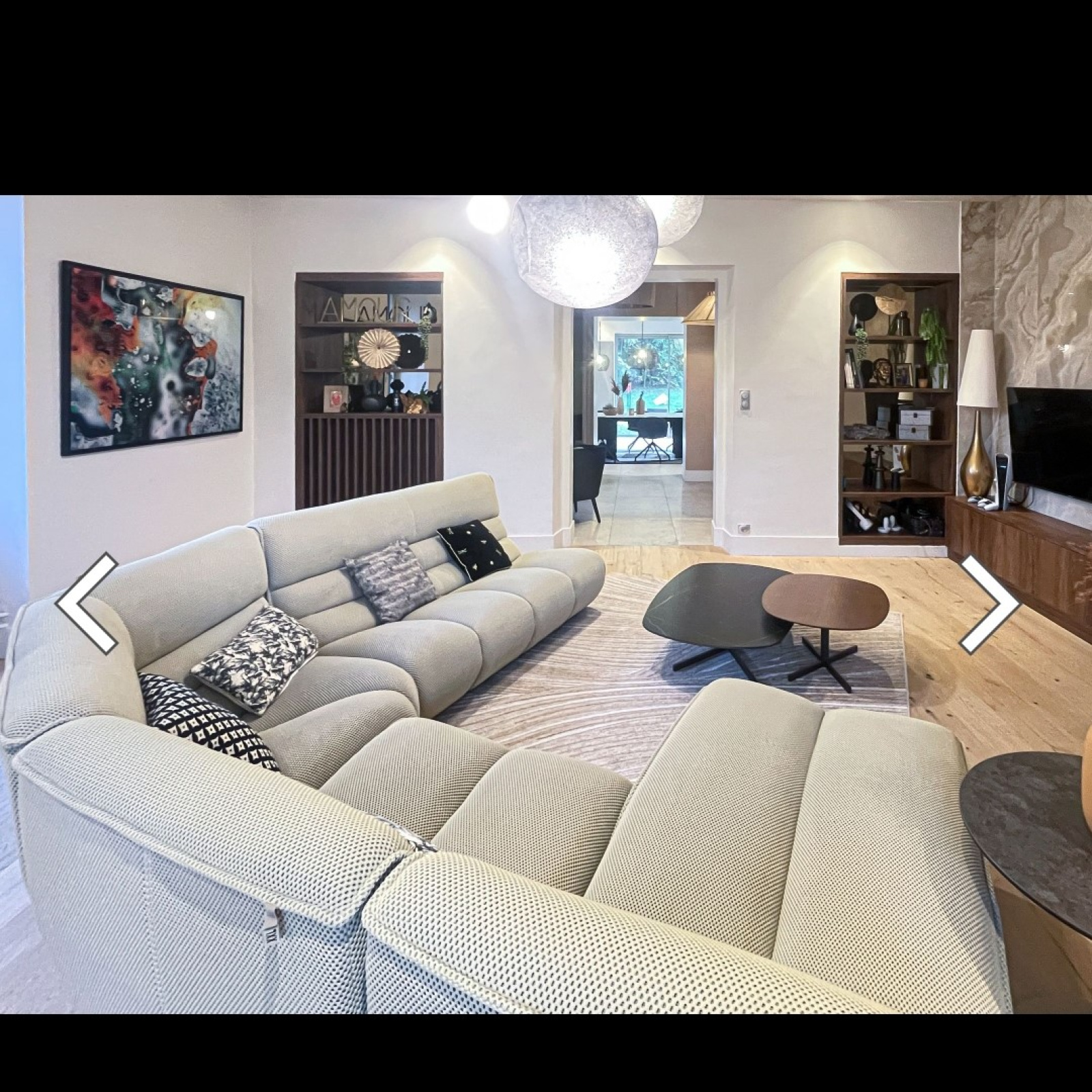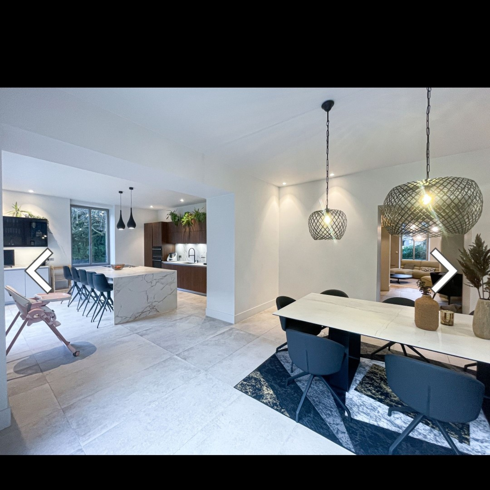 Au rez-de-chaussée : une entrée, une cuisine entièrement équipée ouverte sur la salle à manger, un double salon lumineux, ainsi qu’une cave en sous-sol.