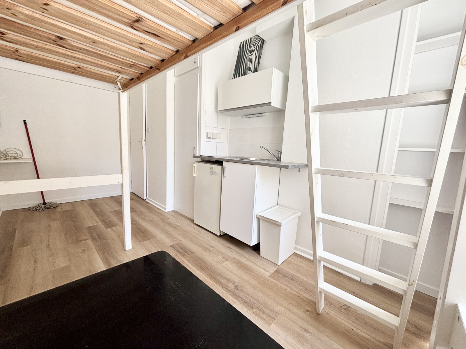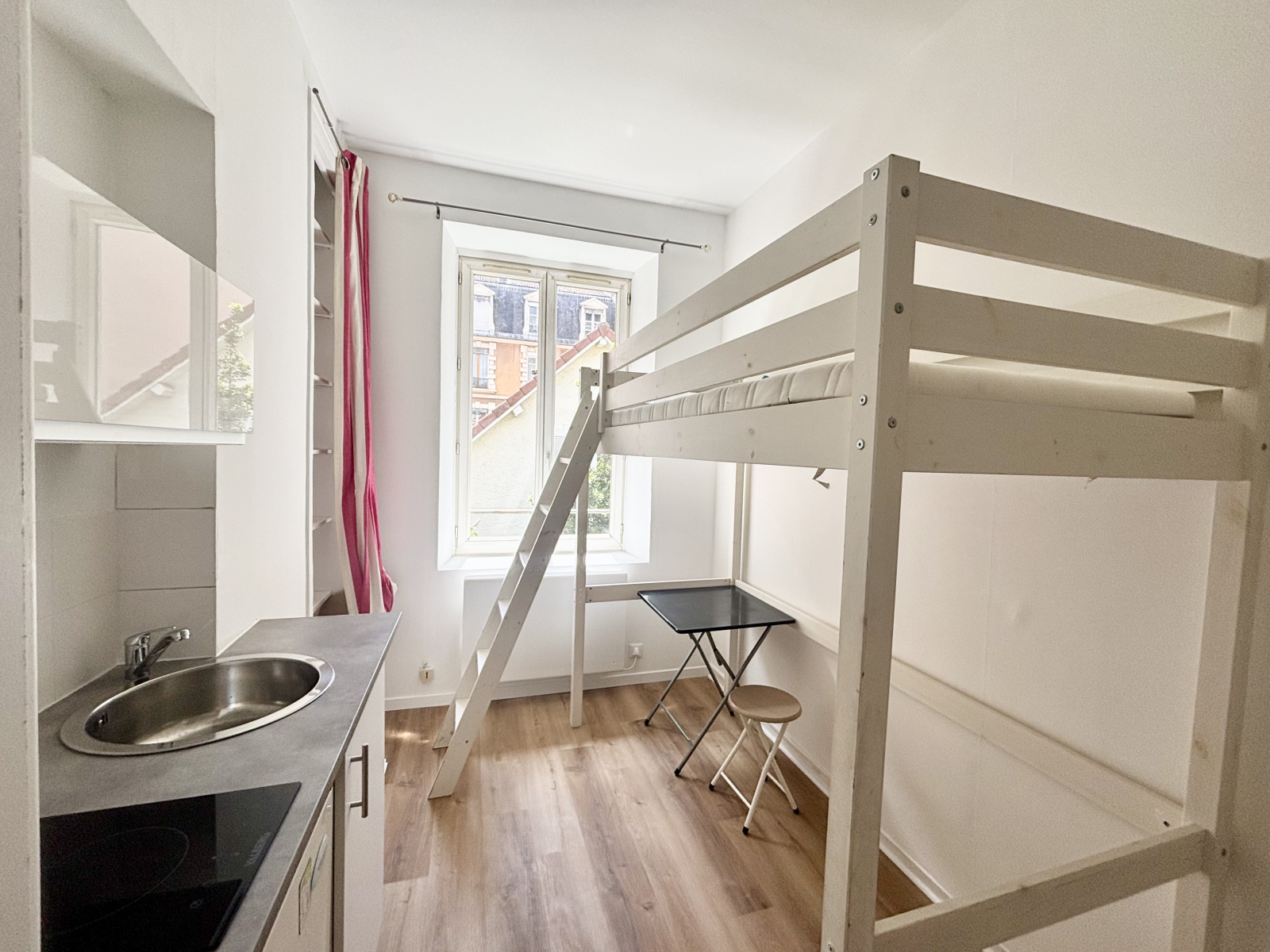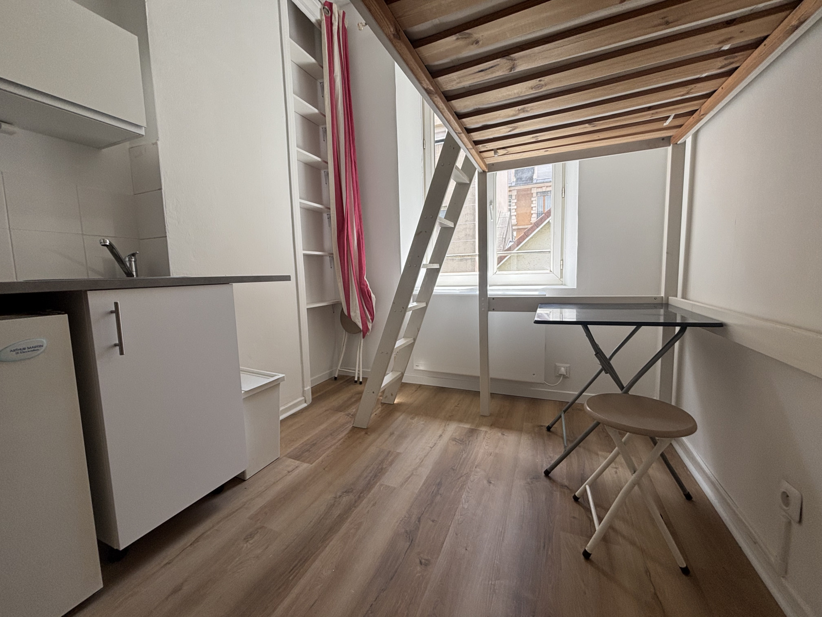 Studio meublé très lumineux composé d'une cuisine équipée ouverte sur pièce de vie, couchage en mezzanine, salle d'eau / WC, situé deuxième étage d'un immeuble en fond de cour - 21 rue Thiers, proximité toutes commodités et écoles, localisation idéale, laverie au pied de l'immeuble.