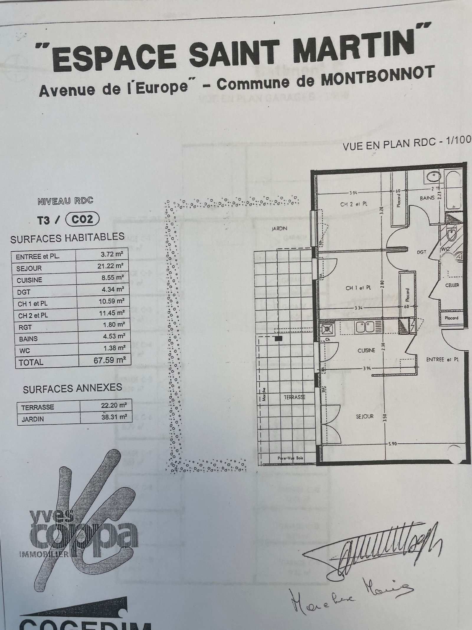 "Espace Saint Martin" à Montbonnot, joli rez de jardin de 67.59m² comprenant un séjour ouvert sur cuisine aménagée et équipée, deux chambres avec placards, salle de bains, 2 WC. Toutes les pièces donnent sur une terrasse de de 22m² et un jardin privatif de 40 m². Un garage fermé de 16.5m² vient compléter la location du bien. Eau froide collective, chauffage individuel gaz, climatisation -