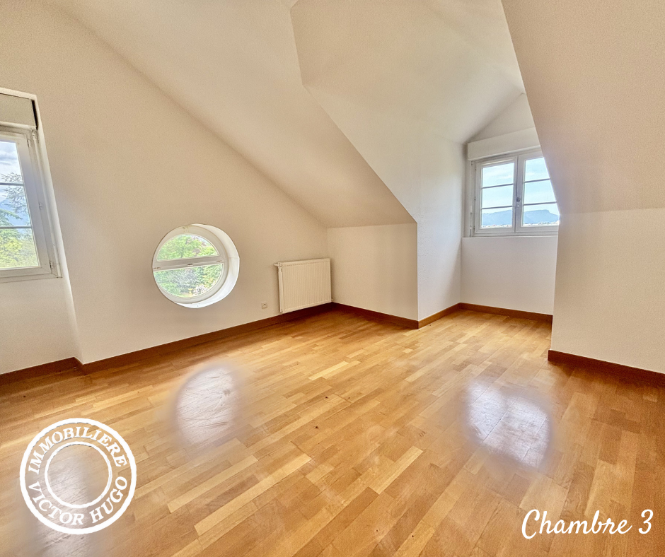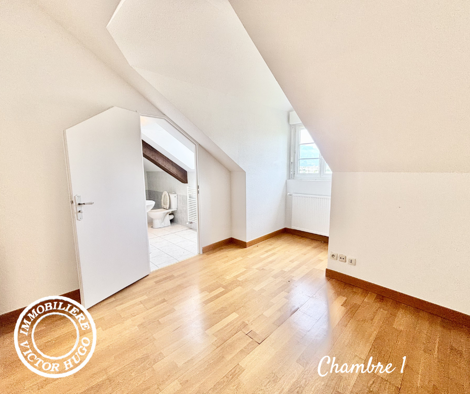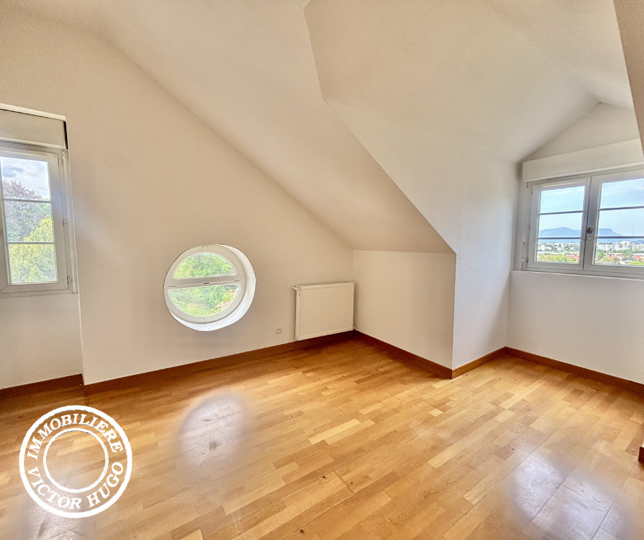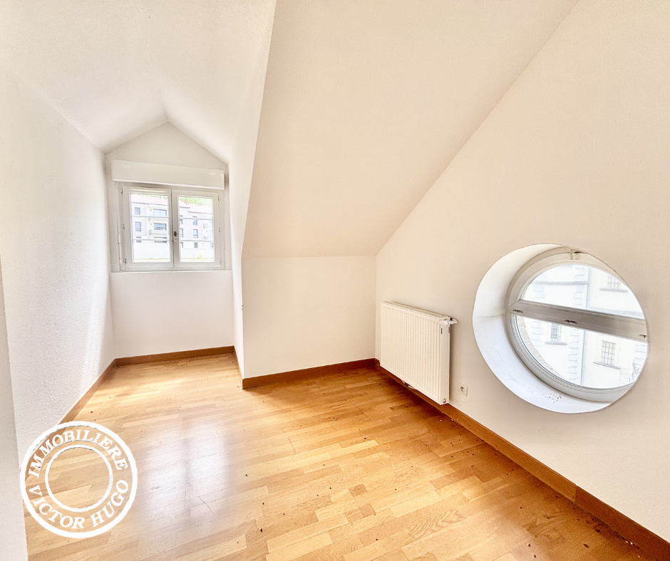Ce T5 d’environ 105 m² se distingue par son caractère atypique : beaux volumes, hauteur sous plafond, poutres apparentes et agencement original. L’espace nuit comprend quatre chambres, dont une avec salle de d'eau privative. Les chambres présentent également un charme particulier avec certaines ouvertures en forme de hublot. Une salle d’eau et des toilettes indépendantes complètent l’ensemble.